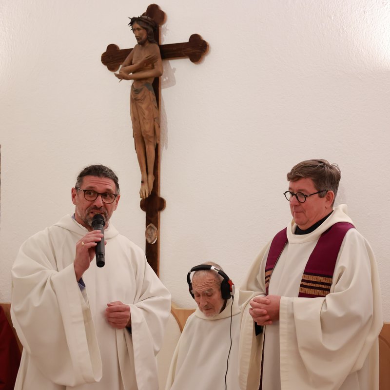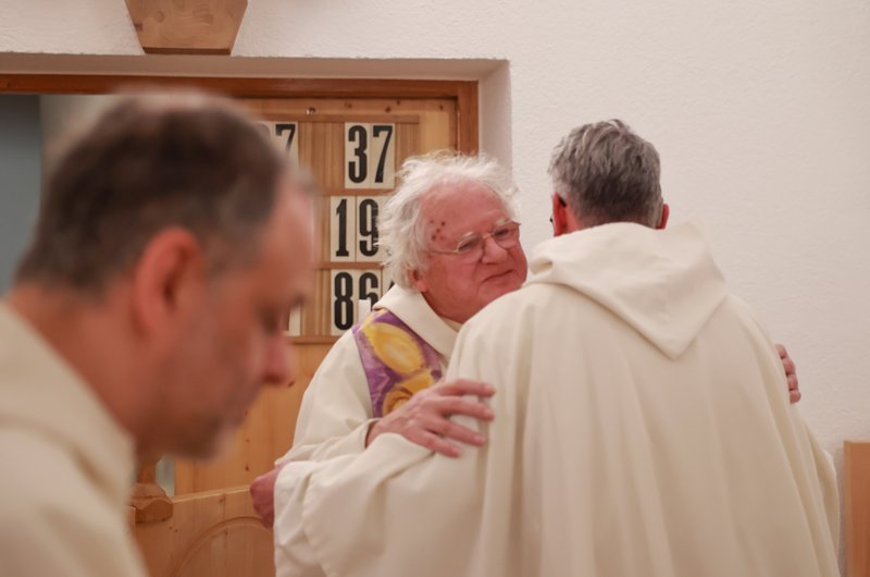In seiner Predigt lies Prior Bruder Thomas Hessler unterschiedliche Wegbegleiter des Klosters und Weggefährten von Bruder Simon zu Wort kommen. „Was bedeutet es für dich, dass es wieder einen neuen Mönch in Gut Aich gibt?“, stellte er die Frage.