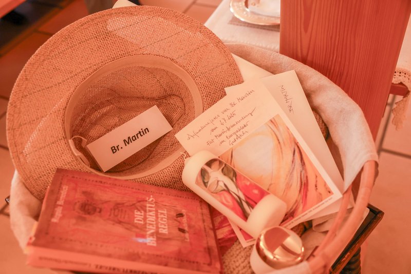 Mit dem Psalm 23 "Der Herr ist mein Hirte" wurde der Gottesdienst begonnen, im Besonderen in Gedanken an die drei Schafe, die Br. Martin nach Gut Aich gebracht hat. In einer kleinen rituellen Segnung wurde Br. Martin gefeiert. Das Buch mit den Regeln des Hl. Benedikt, eine handgestrickte Weste für den Winter und ein Hut für die heißen Sommertage sind die Geschenke der Brüdergemeinschaft an ihn.