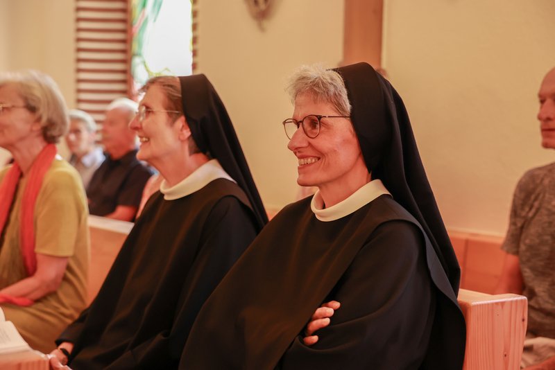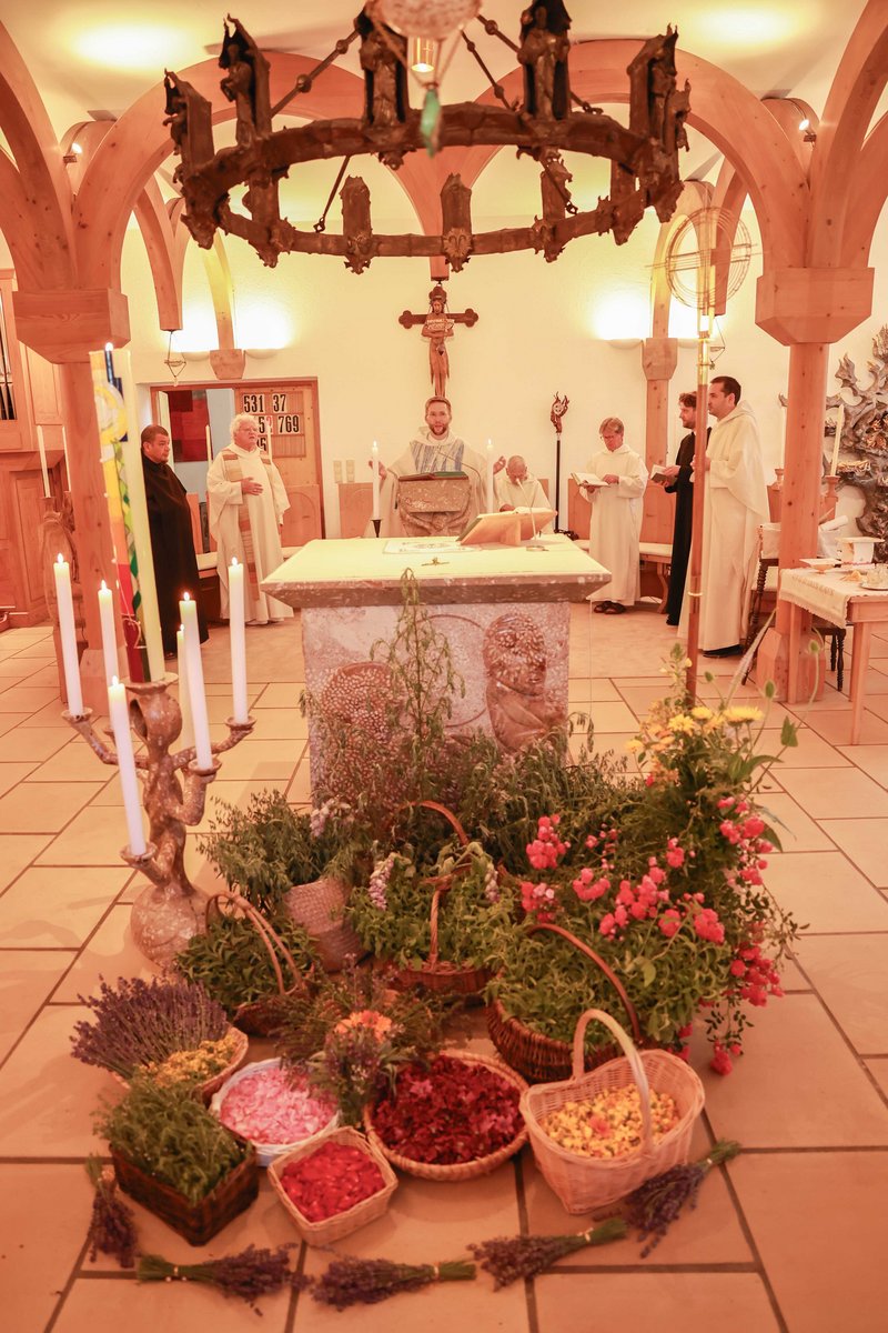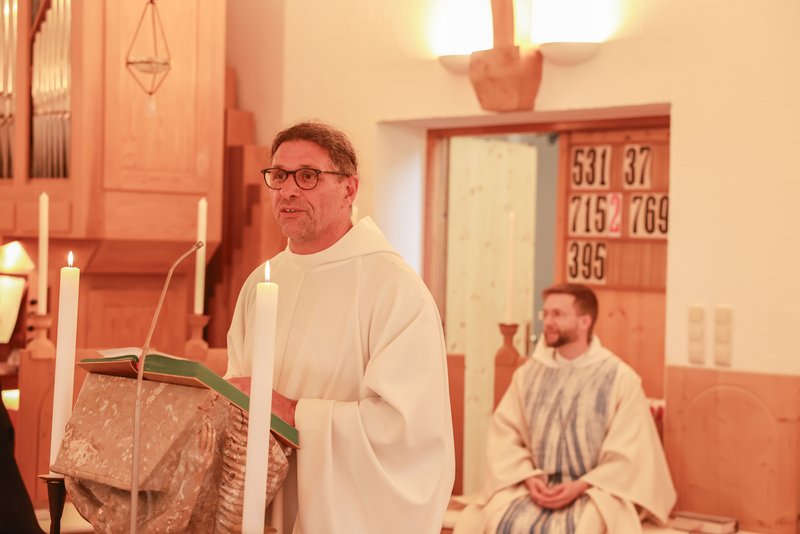 Prior Br. Thomas Hessler begrüßte die Familie von Br. Martin, zahlreiche Freunde, Mitarbeiter*innen und interessierte Menschen in der Klosterkirche. Pater Petrus aus dem Stift St. Paul im Lavantal ist für das Fest angereist und Br. Ramon von den Missionsbenediktinern aus der Schweiz macht derzeit Urlaub in Gut Aich. Mutter Johanna, Äbtissin der Benediktinerinnenabtei Frauenwörth und Sr. Regina, von der Fraueninsel am Chiemsee wohnten ebenfalls dem Gottesdienst bei sowie Sr. Walburg aus Freiburg.