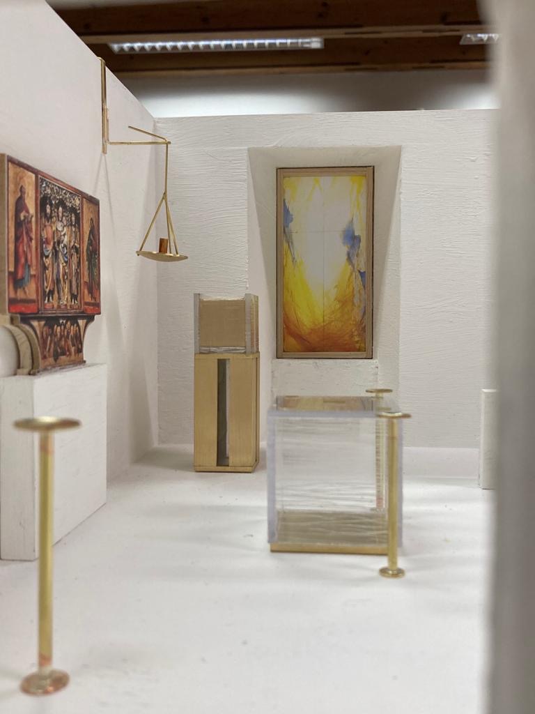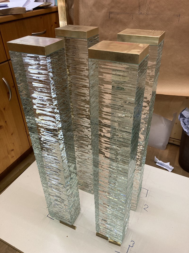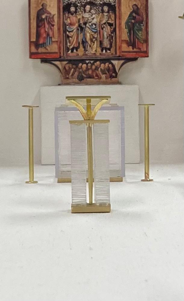 Von Woche zu Woche konnte man wahrnehmen, wie Tabernakel, Altar, Ambo und das Ewige Licht entstanden sind. Jedes einzelne Objekt basiert auf dem Hintergrund der Dreifaltigkeit. Die Materialien Messing, Glas und Gold geben der Innenausstattung der neuen Chorkapelle ein besonderes Flair.