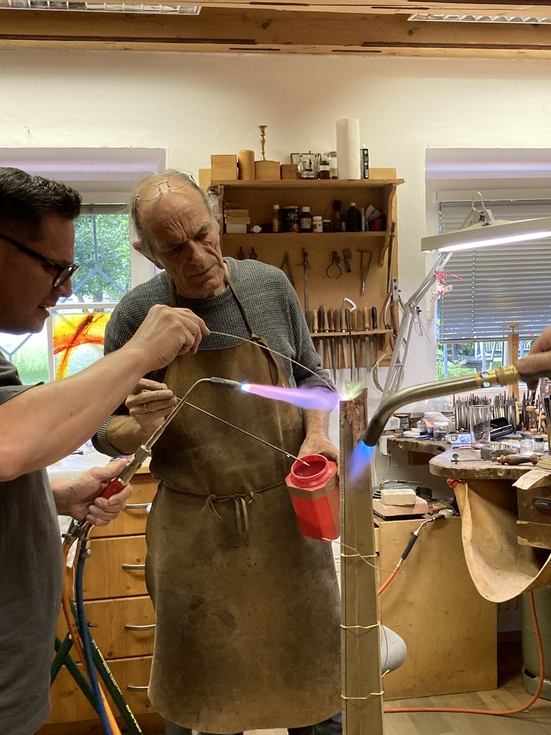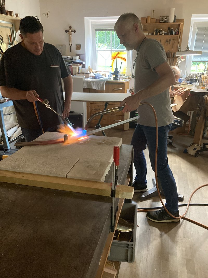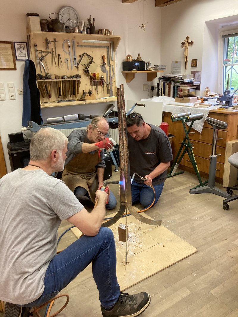 Drei Gold- und Silberschmiede und eine Gold- und Silberschmiedin, unter der Leitung von Michael Van Ooyen, waren über den Sommer sehr beschäftigt. Norbert Van Ooyen nördlich von Krefeld kommend, Gepa Schönenberger unweit von Kaiserslautern und Andreas Bachmeier aus Passau haben die Zeit gut genützt. Alle drei sind erfahrene Gold- und Silberschmied*innen im kirchlichen Bereich (der alte Name ist Kirchengoldschmied) und Restaurator*innen.