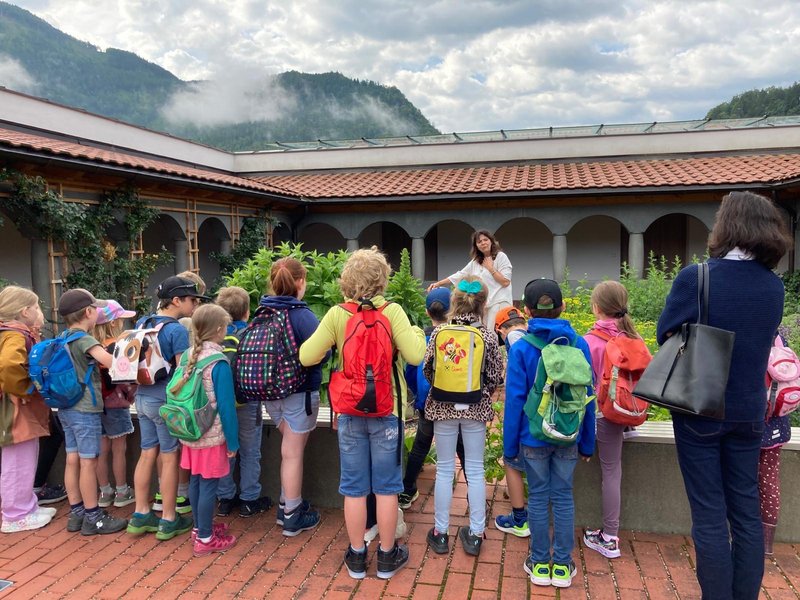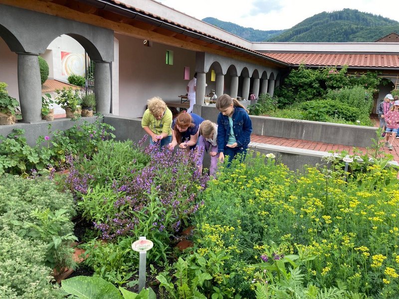 Elke Wölfl, Kröuterpädagogin und Mitarbeiterin der Klostermanufaktur, stellte den Kindern Pflanzen und ihre Besonderheiten vor. Die selbstgemachte Limonade, zubereitet mit Hilfe von Mitarbeiterin Karin Friedl, wurde begeistert verkostet. Die Andacht in der Klosterkirche zum Abschluss machte große Freude.
