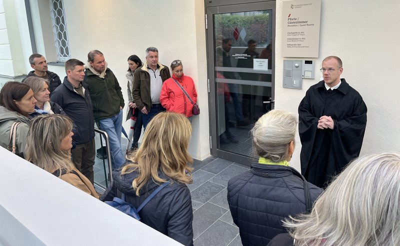 Abt Gerhard begrüßte uns vor dem Eingang zum Museum und Pater Josef gab uns einen Einblick in die jahrhunderte alte Geschichte des Stiftes Admont. 1074 wurde das Stift auf den Wunsch der Hl Hemma von Gurk errichtet. Sie gab Bischof Gebhard den Auftrag in Admont ein Kloster zu gründen. Die ersten Mönche kamen aus dem Stift St. Peter in Salzburg. Derzeit leben 26 Brüder hier und haben 26 Pfarren zu betreuen. Weitere Aufgabenbereiche sind die Erhaltung des Stiftsgymnasium, dort unterrichten fünf Mitbrüder Religion. Ein Drittel der Schüler kommen aus dem Ort Windischgarsten. Die Forstwirtschaft, ein Wasserkraftwerk und eine Photovoltaik-Anlage, Immobilien und die Fabrik Admont AG beschäftigen an die 500 Mitarbeiter*innen. Besonders ist die Aktion "Essen auf Rädern", welche im Umfeld von Admont aus der Stiftsküche organisiert wird.