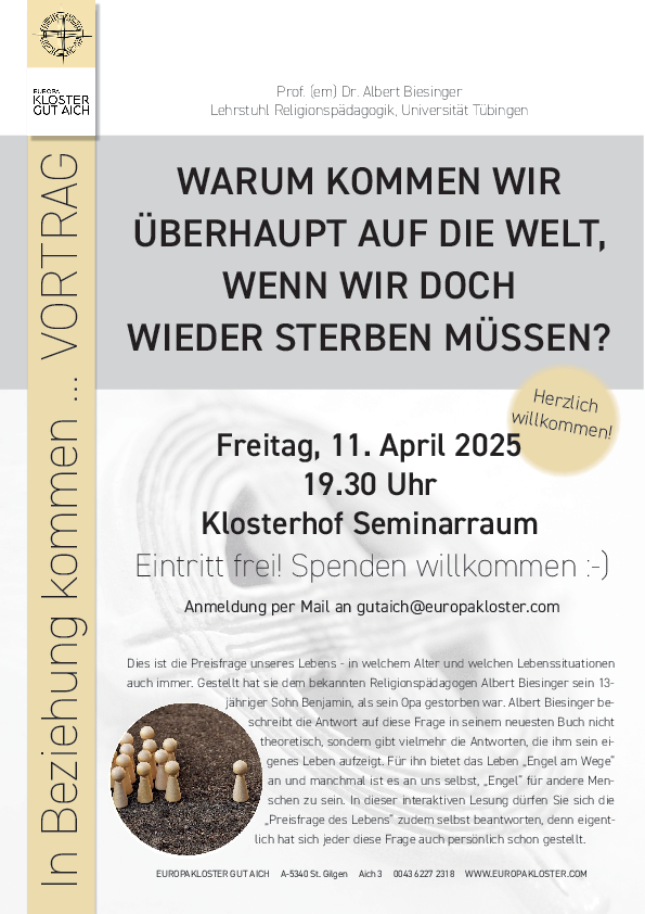 Danke für euer Interesse am Vortrag von Prof. Albert Biesinger zum Thema „Warum kommen wir überhaupt auf die Welt, wenn wir doch wieder sterben müssen?“