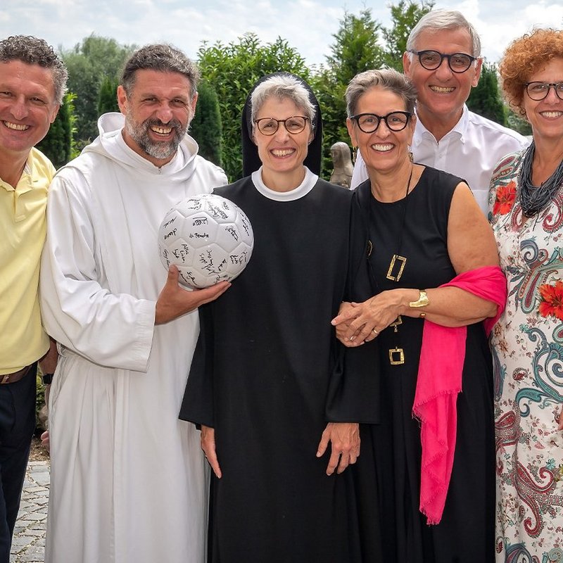 03/Schwester Regina Hessler mit ihrem Zwillingsbruder bei ihrer Ewigen Profess. Mit ihr freuen sich ihre drei weiteren Geschwister mit Familie. Früher spielte die Benediktinerin gerne Fußball, daher bekam sie einen geschenkt.